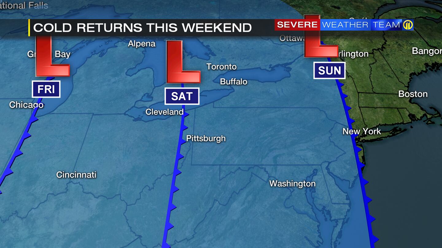 This same cold front causing the soaking rain will also bring a change in temperatures. Friday night’s low will be around 50 degrees and it won’t rebound very much once we get into the weekend.