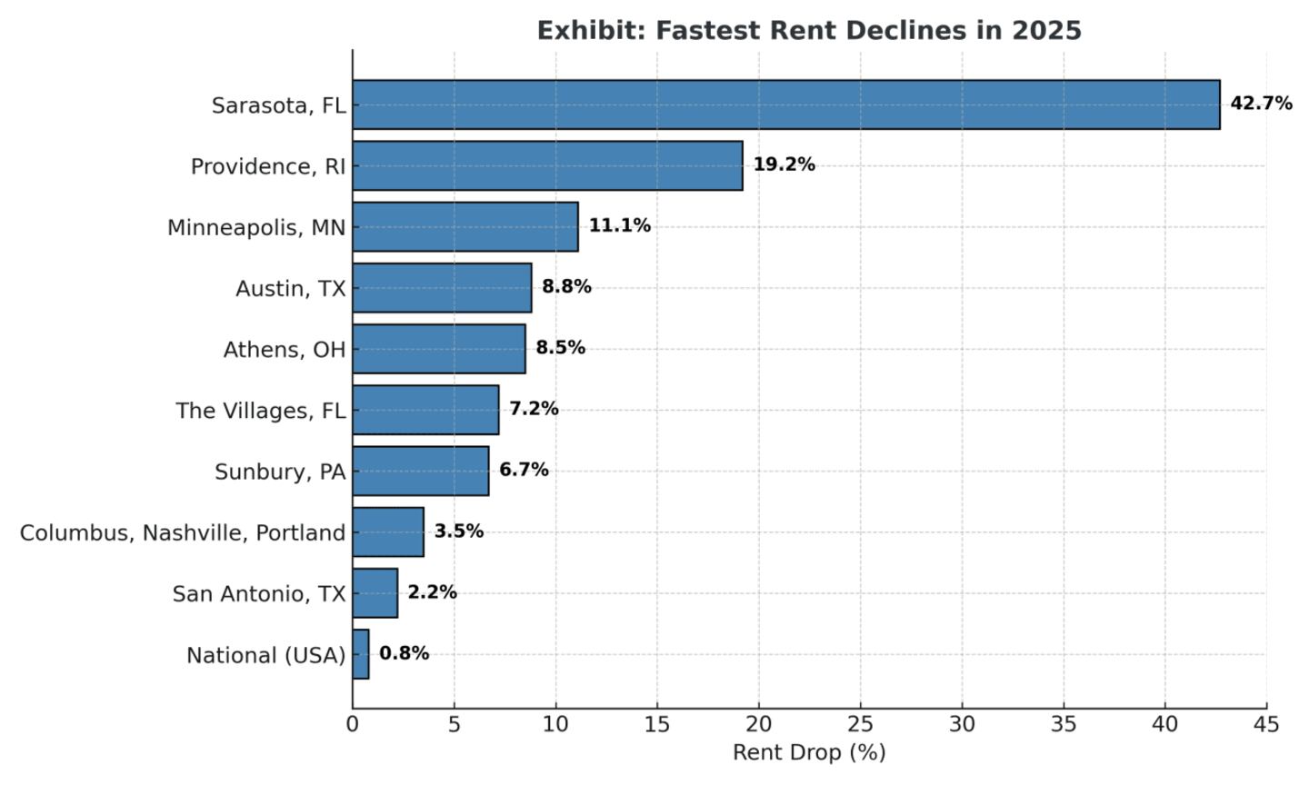 A comprehensive review by BiggerPockets identified numerous smaller cities experiencing steep rent declines in 2025: