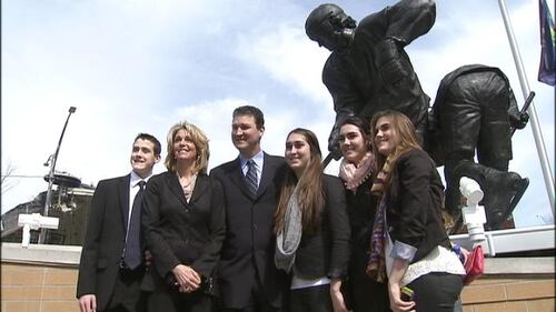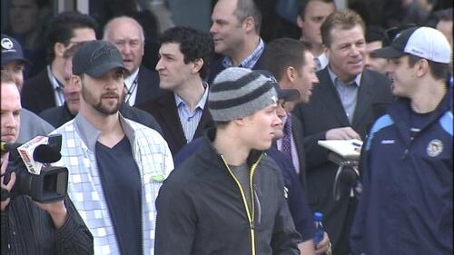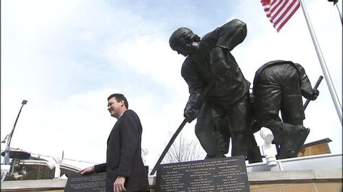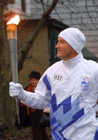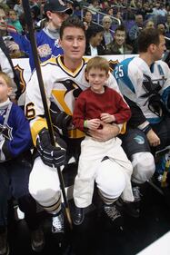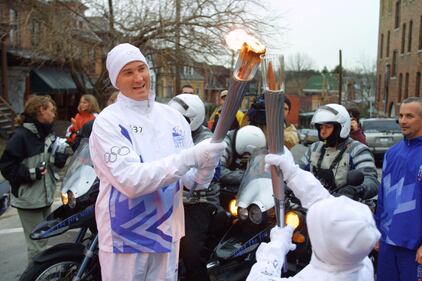 Celebs Carry Olympic Flame 398924 01: Torchbearer Mario Lemieux passes the Olympic Flame to Ashley Barrasso during the 2002 Salt Lake Olympic Torch Relay December 20, 2001 in Wilkinsburg, PA. (Photo by Todd Warshaw/Getty Images) (Todd Warshaw/Getty Images)