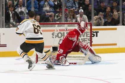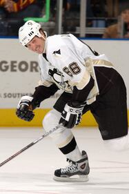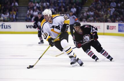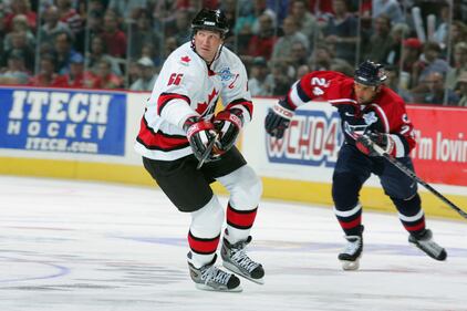 Pittsburgh Penguins v New Jersey Devils EAST RUTHERFORD, NJ - OCTOBER 5: Center Mario Lemieux #66 of the Pittsburgh Penguins passes against the New Jersey Devils on October 5, 2005 at Continental Airlines Arena in East Rutherford, New Jersey. The Devils defeated the Penguins 5-1. (Photo by Jim McIsaac/Getty Images) (Jim McIsaac/Getty Images)
