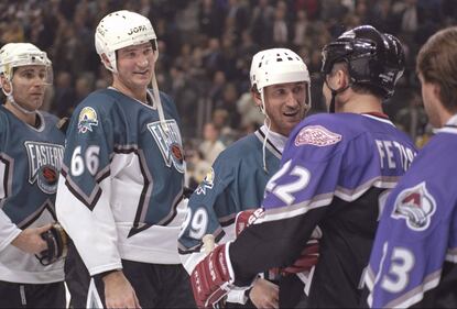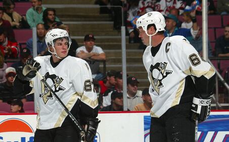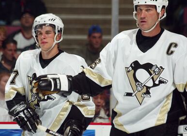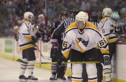 1996 46th NHL All-Star Game: Western Conference v Eastern Conference BOSTON, MA - JANUARY 20: Jaromir Jagr #68 and Mario Lemieux #66 both of the Eastern Conference and the Pittsburgh Penguins stand on the ice before the 1996 46th NHL All-Star Game against the Western Conference on January 20, 1996 at the FleetCenter in Boston, Massachusetts. The Eastern Conference defeated the Western Conference 5-4. (Photo by Doug Pensinger/Getty Images) (Doug Pensinger/Getty Images)