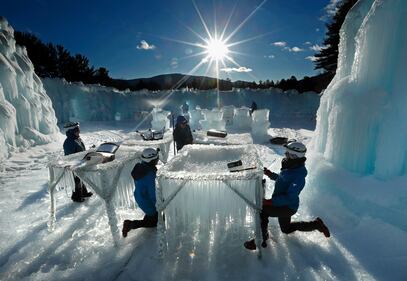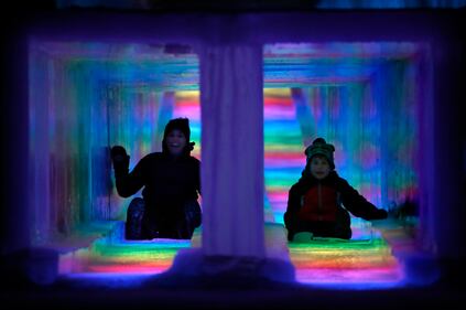 In this Friday, Jan. 25, 2019 photo, visitors race down the side-by-side tunnels of a 97-foot ice slide at Ice Castles in North Woodstock, N.H. The winter wonderland is one of six in North America. (AP Photo/Robert F. Bukaty)