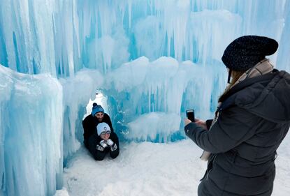 In this Saturday, Jan. 26, 2019 photo, visitors pose for a photo in a tunnel at Ice Castles in North Woodstock, N.H. With a seemingly endless variety of photo-ops, most visitors have a hard time putting their cameras down. (AP Photo/Robert F. Bukaty)