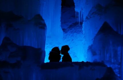 In this Friday, Jan. 25, 2019 photo, a couple enjoy the Ice Castles in North Woodstock, N.H. "It's a really popular date night spot," said castle builder Matt Pasciuto. "I can't tell you how many marriage proposals I've seen so far in the castle." (AP Photo/Robert F. Bukaty)