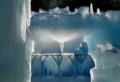 In this Monday, Jan. 28, 2019 photo, a sprinkler sprays a fine mist over a metal rack to grow icicles at Ice Castles in North Woodstock, N.H. Ice artists will harvest the icicles and use them to grow the castles' walls. (AP Photo/Robert F. Bukaty)