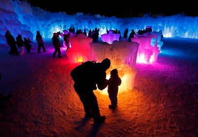 In this Saturday, Jan. 26, 2019 photo, Bruce McCafferty and his son, Dougie, pause while exploring the ice formations growing at Ice Castles in North Woodstock, N.H. (AP Photo/Robert F. Bukaty)