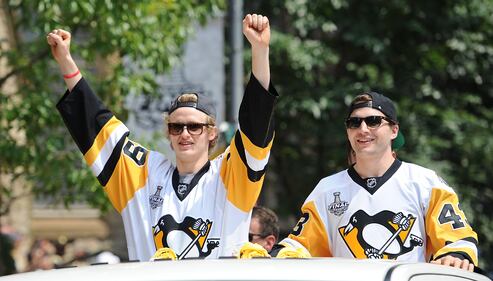 Pittsburgh Penguins Victory Parade And Rally PITTSBURGH, PA - JUNE 14: Jake Guentzel #59 and Conor Sheary #43 of the Pittsburgh Penguins ride in the Victory Parade and Rally on June 14, 2017 in Pittsburgh, Pennsylvania. (Photo by Justin Berl/Getty Images) (Justin Berl/Getty Images)