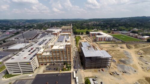 Bakery Square in East Liberty Bakery Square and 2.0 overlooking the lawn where Bakery Office 3 is currently being constructed. (Walnut Capital)