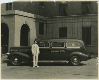 Shadyside Hospital Historical Photos An image of a man standing next to a Homeopathic Hospital ambulance, taken in 1921. The image contains a caption that reads "one of the finest ambulances in Pgh." (Detre Library & Archives, Sen. John Heinz History Center)
