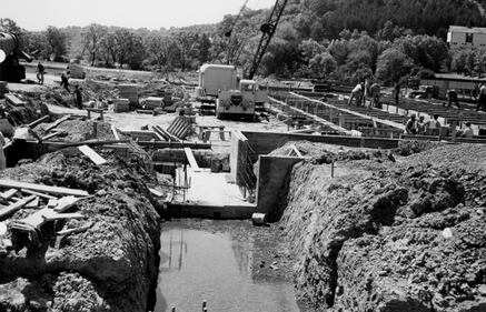 The North Park Ice Rink opened to skaters for the first time on Feb. 18, 1961. Construction site of North Park Ice Rink shown along with laborers and construction equipment. Photo shows construction of skating rink and clubhouse, including the refrigeration tunnel in the clubhouse. Police horse barn visible in right-hand background. Located in North Park, Allegheny County Park, Allegheny County, PA. (June 19, 1959) (Northland Historical Image Collection)