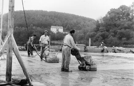 The North Park Ice Rink opened to skaters for the first time on Feb. 18, 1961. View of laborers grinding terazzo on the rink during construction of the North Park Ice Rink. Police horse barn visible in center background. Located in North Park, Allegheny County Park, Allegheny County, PA. (October 8, 1959) (Northland Historical Image Collection)