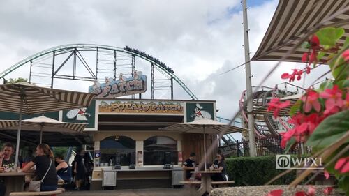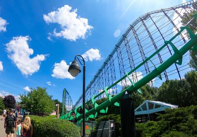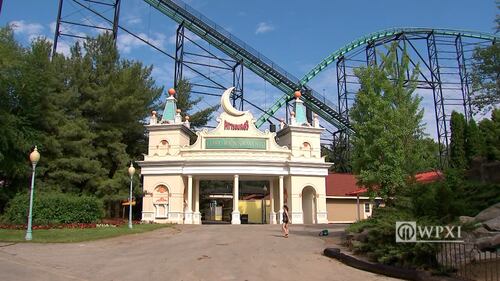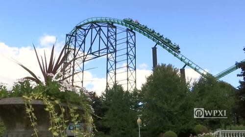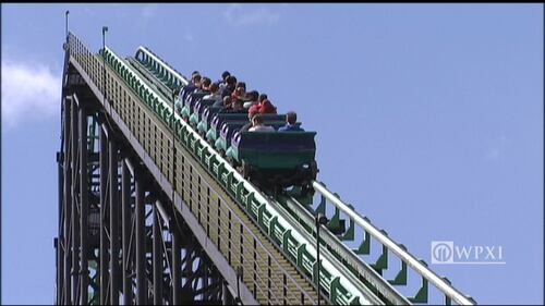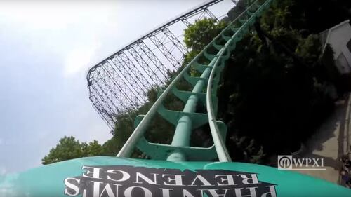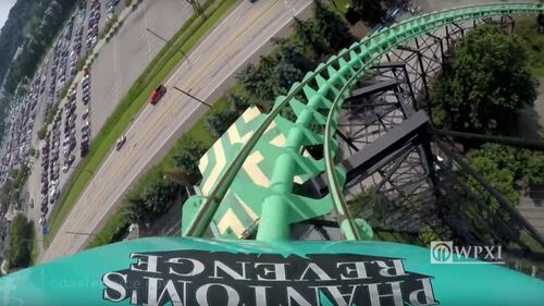 PHANTOM'S REVENGE The second hill, a 230- foot plunge, on the new Phantom's Revenge coaster at Kennywood Park passes through the vintage Thunderbolt wooden coaster April 19, 2001 in West Mifflin, Pa.. The new coaster, which uses the first two hills of the Steel Phantom coaster, reaches a top speed of 85mph.(AP Photo/Gene J. Puskar) (GENE J. PUSKAR/Associated Press)