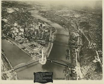Gateway to the West An image of a proposed redevelopment plan of the Point in downtown Pittsburgh, featuring a "Gateway to the West" monument. (Mel Seidenberg Photographs, Detre Library & Archives, Heinz History Center)
