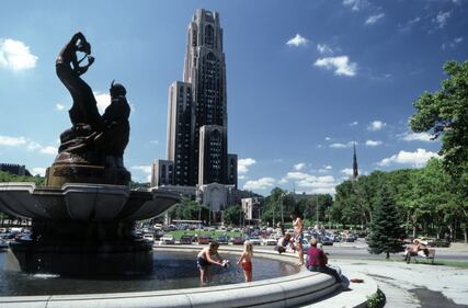 Schenley Park history People in the Mary Schenley Memorial Fountain in front of the Frick Fine Arts Building at the University of Pittsburgh. The Cathedral of Learning is visible in the background. Picture from 1987, (Archives & Special Collections, University of Pittsburgh Library System)