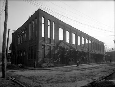 South Side Market House View of South Side Market after the fire of February 6, 1915. The Market House has lost its original roof and towers, along with most of its windows. Debris removed from the market house can also be seen on the sidewalk. (Archives & Special Collections, University of Pittsburgh Library System)
