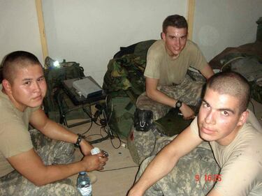 Spc. Ross Andrew McGinnis Spc. McGinnis (then Pfc.) with buddies Pfcs. Raymond Thomas and Edmond Leaveck, following a day of vigorous training in Kuwait, August 2006. (The U.S. Army, Family Album: Medal of Honor recipient Pfc. Ross A. McGinnis)