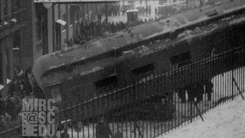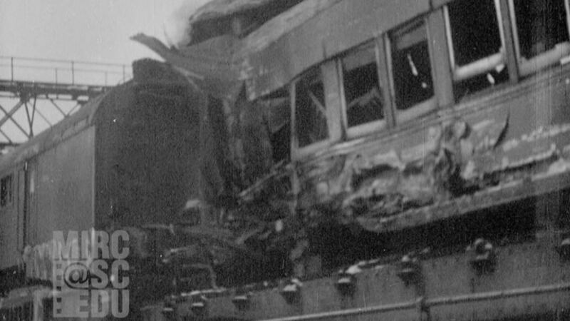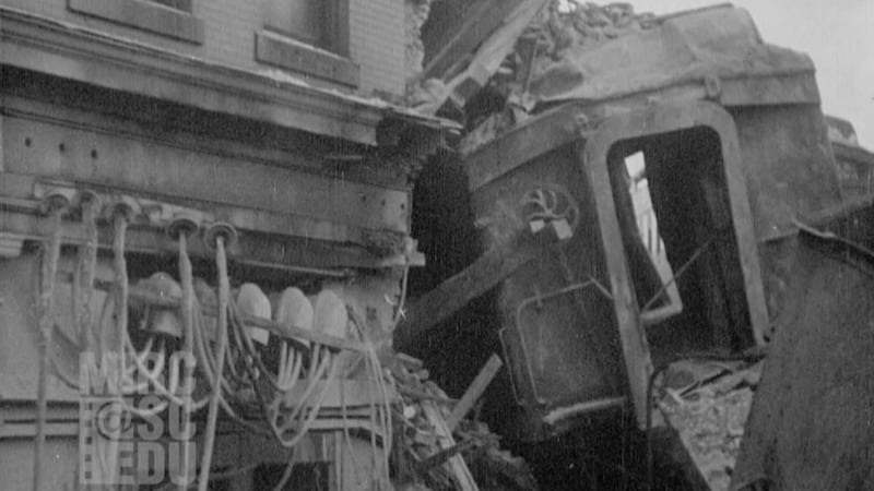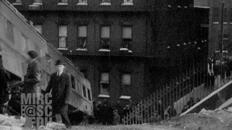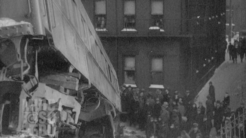 1934 North Side train crash A Pennsylvania Railroad passenger train inbound from Akron, Ohio jumped a frozen switch as the tracks turned over Merchant Street on the North Side on Feb. 26, 1934. The train plummeted down the high culvert, obliterated an electrical substation and demolished part of the D. L. Clark candy factory’s northwest wall, killing nine people on board. (University of South Carolina, Moving Image Research Collections)