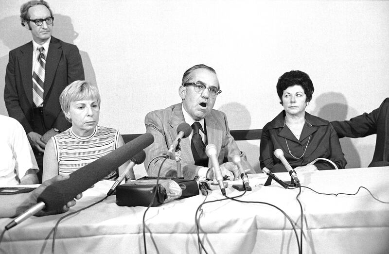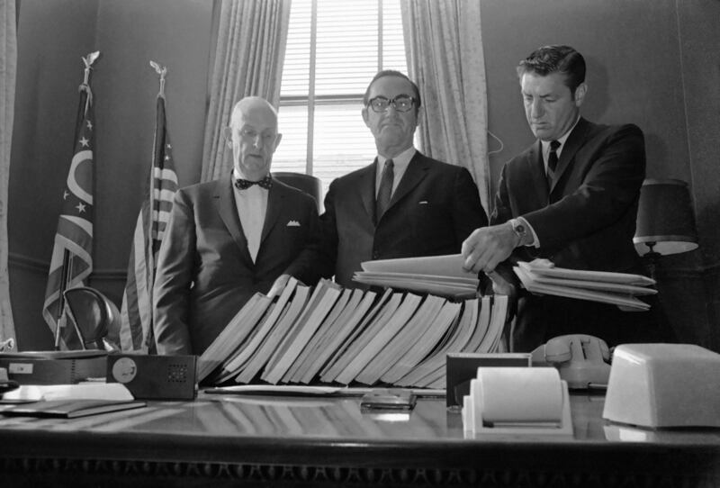 Kent State University shooting Ohio Attorney General Paul Brown, center, poses in his office in Columbus, Aug. 11, 1970, with Robert L. Balyeat, right, Lima attorney, and Seabury H. Ford, Ravenna attorney, as they start to go over the huge file of data on the shooting deaths of four Kent State students. A special Grand Jury has been called for later this month and Balyeat will direct the preparation and presentation of evidence. Ford is one of the assistants. The FBI report, which is said to be the size of all of these reports, will arrive on Wednesday. (AP Photo/Gene Herrick) (Gene Herrick/AP)