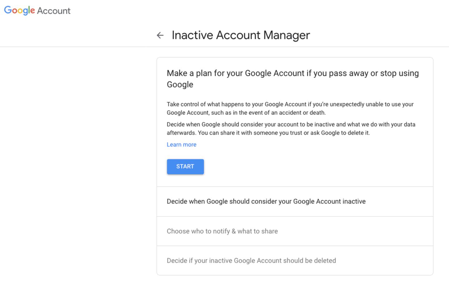 Google says Inactive Account Manager is a way to “Take control of what happens to your Google Account if you’re unexpectedly unable to use your Google Account, such as in the event of an accident or death.” You are able to decide which data gets saved and designate the people who can have access to it — or have your account deleted entirely.