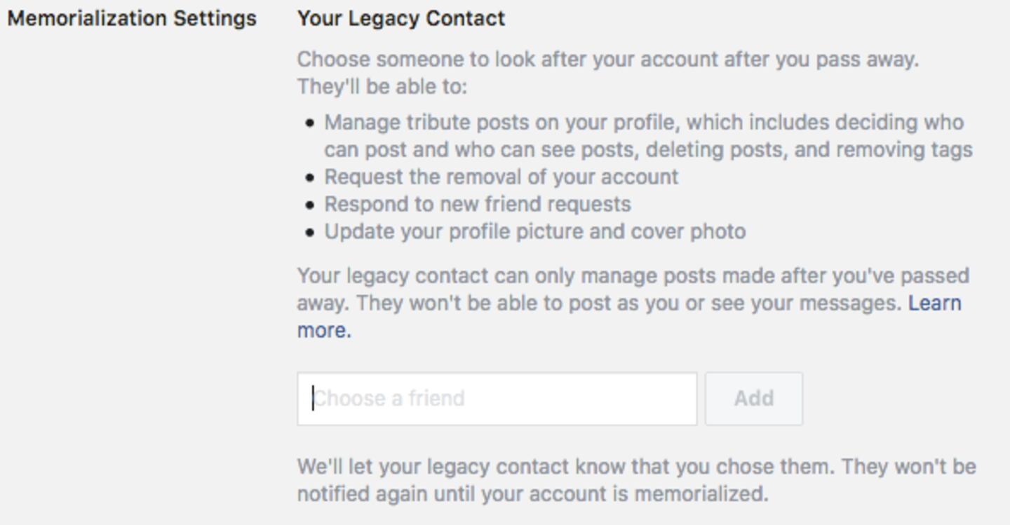 Facebook allows its users to designate what it calls a “legacy contact.” This is someone who can take certain actions on your account after you pass away and your account has been “memorialized.”