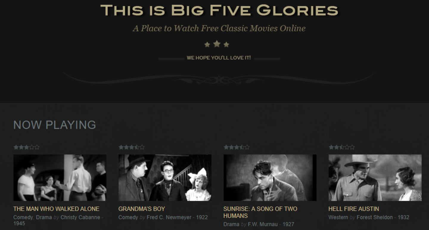 Classic movies in black and white are the specialty of Big Five Glories, which features films from back in the day. The site uses a YouTube video player to host scores of old-time films, including some featuring some old Hollywood greats like Charlie Chaplin.