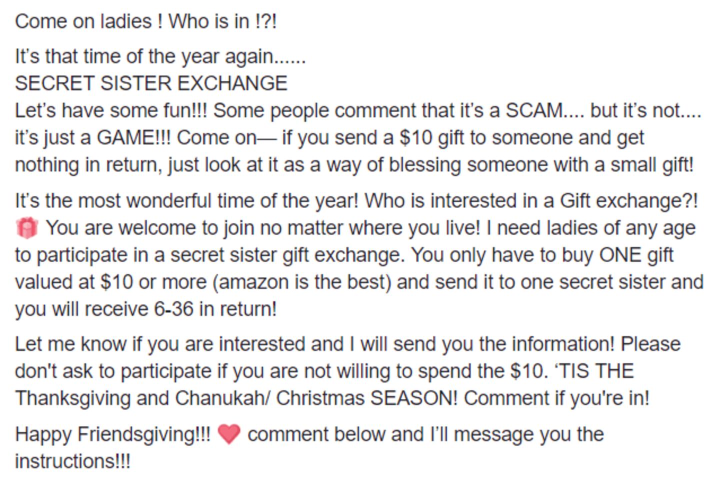 Have you seen the ‘Secret Sister' gift exchange post on Facebook? It's a scam
