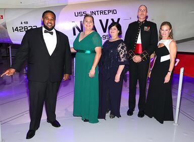 Photos: Meghan Markle, Prince Harry walk red carpet at Salute to Freedom Gala Valor Award recipients Julian Kitching, Kyle Hines, Barbara Block, Stephen Rudinski and Intrepid Museum President Susan Marenoff-Zausner pose for a photo together at the annual Salute to Freedom Gala on November 10, 2021, in New York City. (Theo Wargo/Getty Images for Intrepid Sea, Air, & Space Museum)