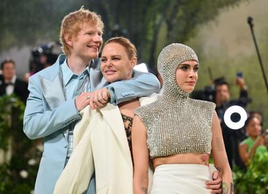Met Gala 2024: British musician Ed Sheeran, British fashion designer Stella McCartney and British model and actress Cara Delevingne arrive for the 2024 Met Gala. (ANGELA WEISS/AFP via Getty Images)