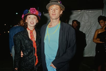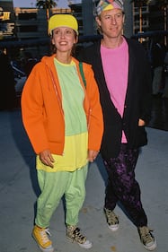 Through the years American actress Shelley Duvall, wearing an orange jacket over a pale green-and-yellow outfit with a yellow hat, and American singer, songwriter and musician Dan Gilroy, who wears a black blazer over a pink t-shirt with pink-and-black trousers, attend the Los Angeles premiere of 'Back to the Future Part III', at Cineplex Odeon Cinemas in Los Angeles, California, 21st May 1990. (Photo by Vinnie Zuffante/Getty Images) (Vinnie Zuffante/Getty Images)