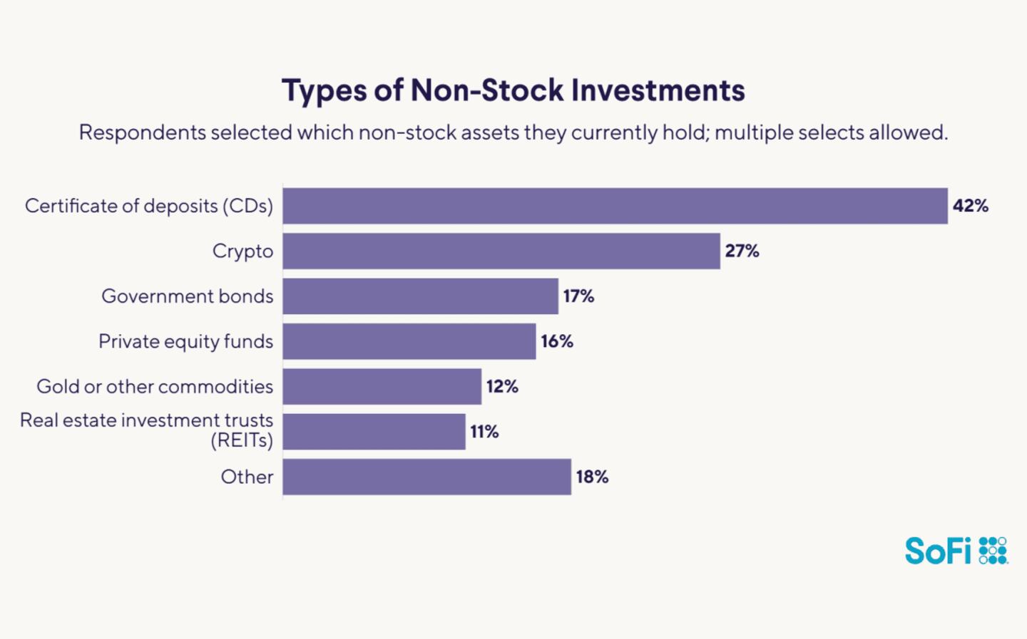 Investors seem to be taking an intrepid stance regarding their investments. In fact, 82% of our respondents invested money into a non-stock-market-related asset, including CDs (certificates of deposit), crypto, as well as gold and other commodities.