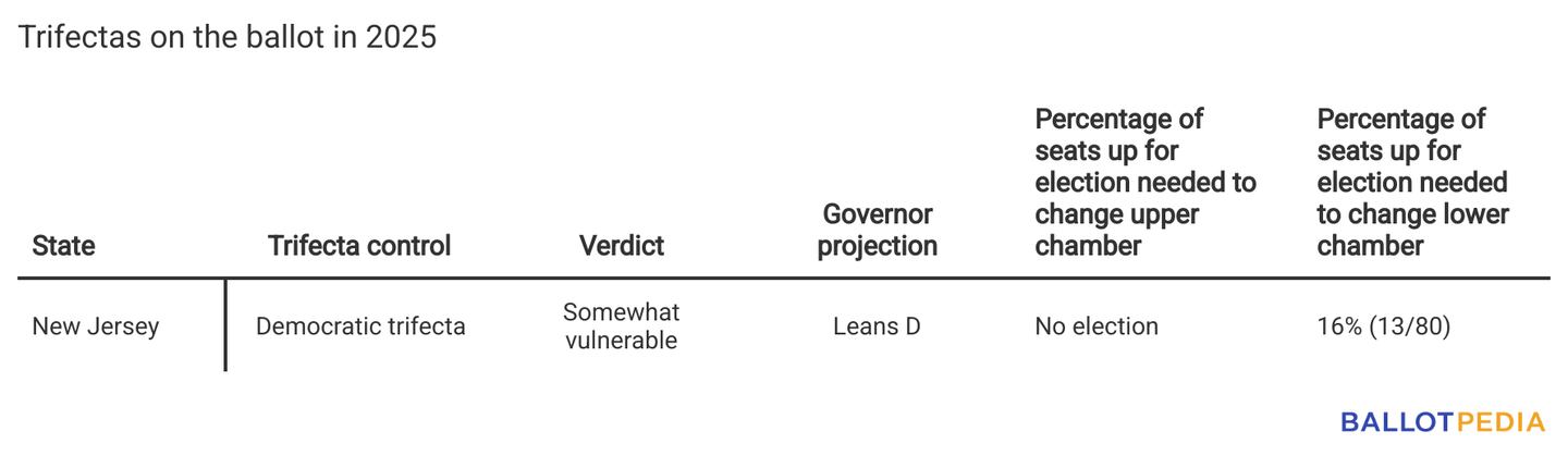 New Jersey's Democratic state government trifecta is somewhat vulnerable in 2025, and a new Democratic trifecta in Virginia is a moderate possibility according to Ballotpedia's 2025 trifecta vulnerability ratings.