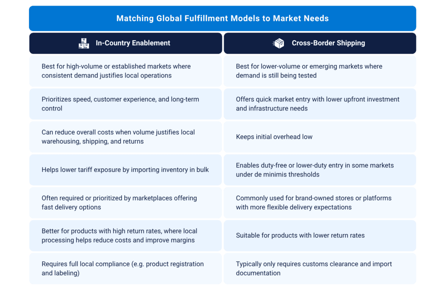 In high-demand regions like the U.S., Canada, the U.K., the EU, Australia, and Mexico, in-country fulfillment offers clear advantages. It gives brands more control, faster delivery, and lower landed costs, making it a smart move when order volume supports local operations.