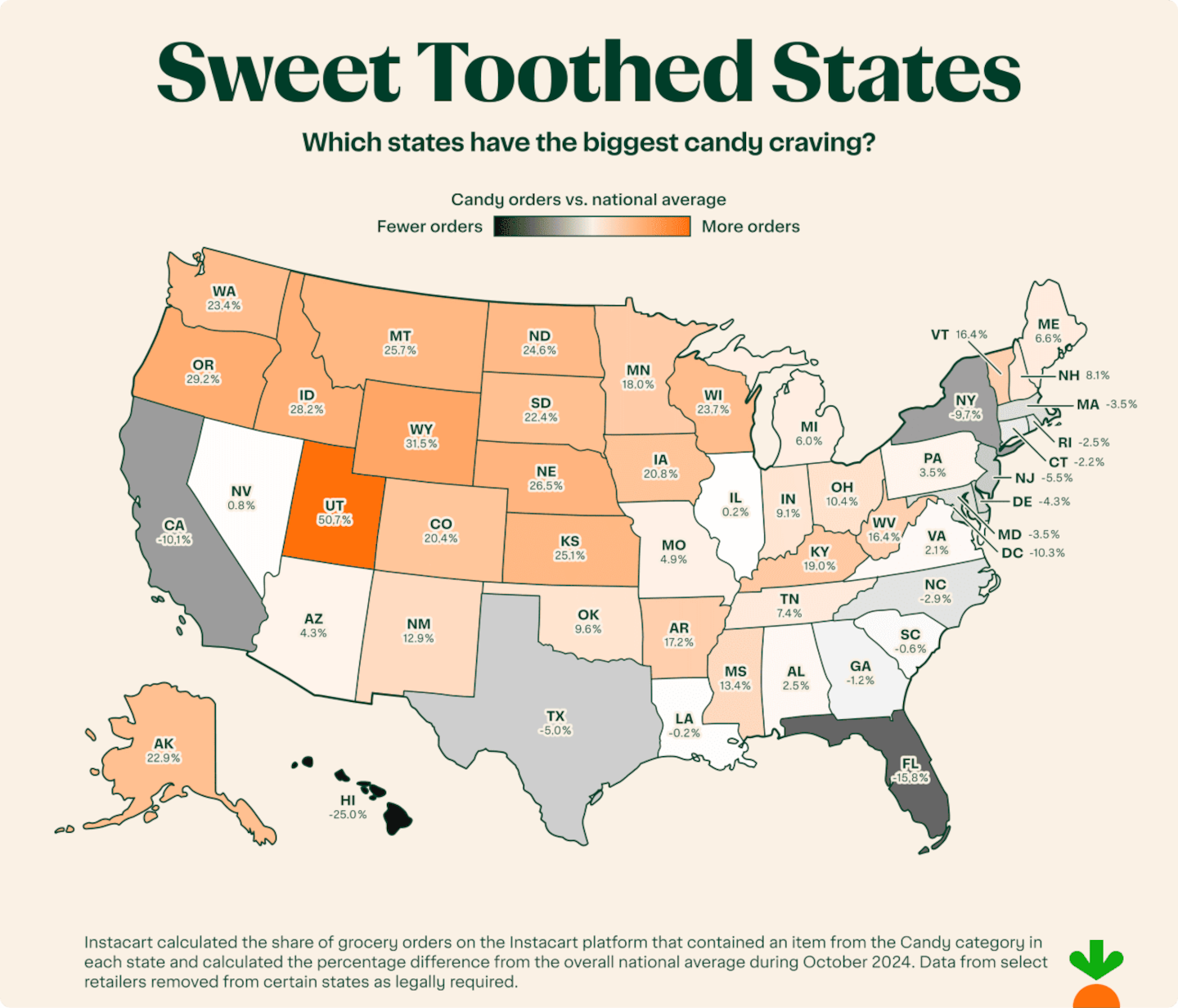 Who loads up on candy the most? Since Utah’s first full year on the Instacart platform, Utah has once again decisively claimed the crown, buying candy 50% more often than the national average in October 2024. The Mountain West and Midwest dominated the leaderboard, with Wyoming, Oregon, Idaho, and Nebraska rounding out the top five. On the flip side, states like Hawai‘i, Florida, and California purchased candy at rates well below the national average — proof that America’s sweet tooth isn’t evenly shared.