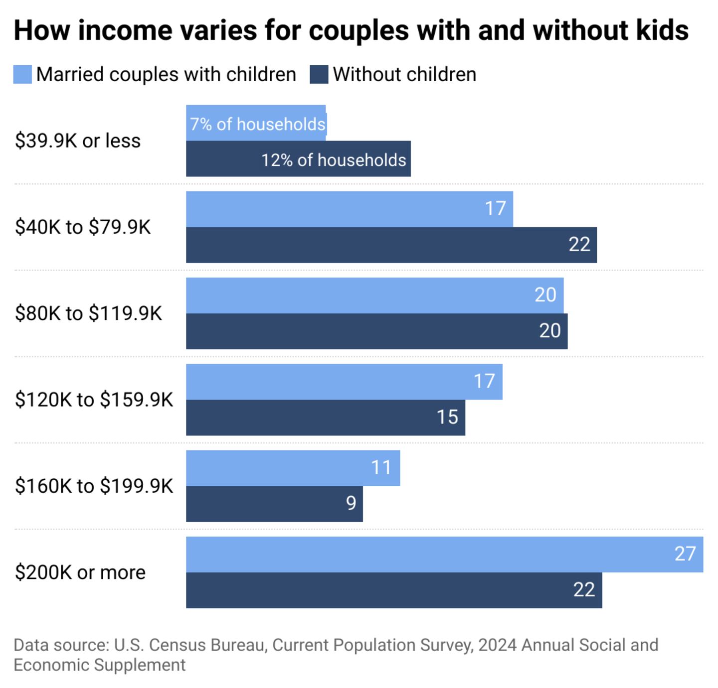 Married couples usually have a higher median income than single-income families. In 2023, married couples had the highest median income at $119,400 versus $81,890 and $59,470 for households maintained by men and women, respectively, according to Census Bureau data. Still, these households don't always accumulate significantly more wealth. Child-free couples tend to have more money for discretionary spending and commonly put it toward things like travel and luxury items. They may also have more ability to put their money into long-term assets like homeownership or retirement savings.