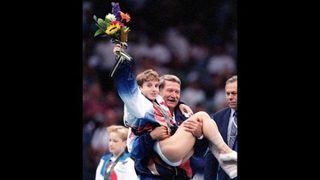 The team – made up of Shannon Miller, Dominique Moceanu, Dominique Dawes, Kerri Strug, Amy Chow, Amanda Borden and Jaycie Phelps – is probably best known for Strug landing a vault on one foot to clinch the gold medal. She was famously helped off by coach Bela Karolyi.