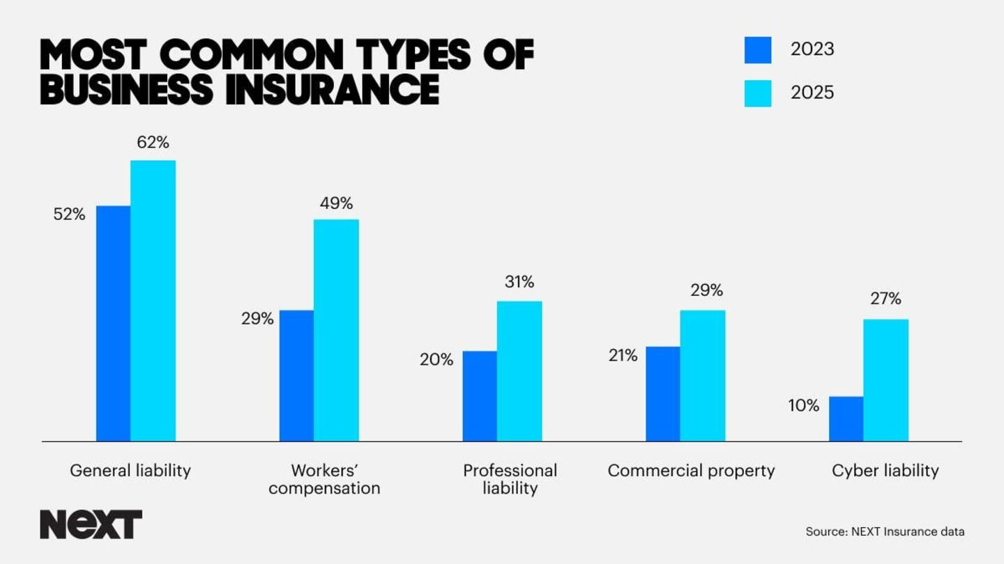 The majority of small businesses (62% in 2025 versus 51% in 2023) have general liability insurance, one of the most common types of business insurance. And with the exception of BOP insurance (Business Owners' Policy), we see increased investment in business insurance across the board.