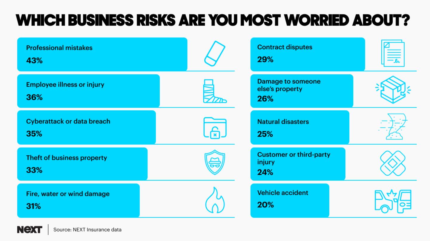 The other top business risks small businesses worry about are employee illness or injury (36%) and cyber attacks (35%).