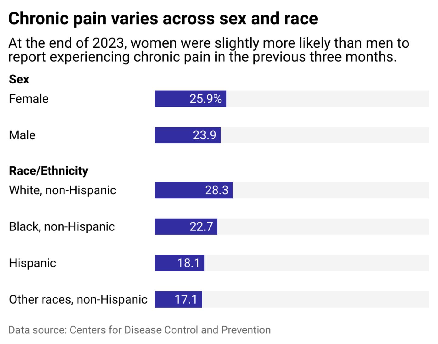 These and other symptoms of chronic pain are often associated with older adults, but chronic pain is a pervasive public health issue that is hard to measure. Nearly 1 in 4 adults said they experienced chronic pain, according to a 2023 survey by the Centers for Disease Control and Prevention. Almost 1 in 10 reported that their daily life or work had been impacted by persistent, debilitating pain in the past three months. On top of the personal toll that chronic pain takes on Americans, the financial cost to the country of health care expenses and lost productivity can exceed hundreds of billions of dollars annually.