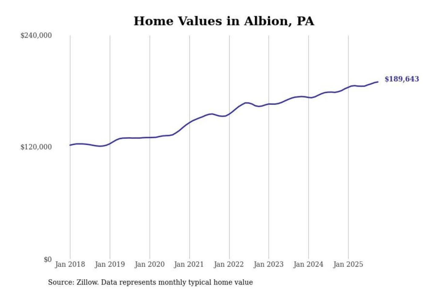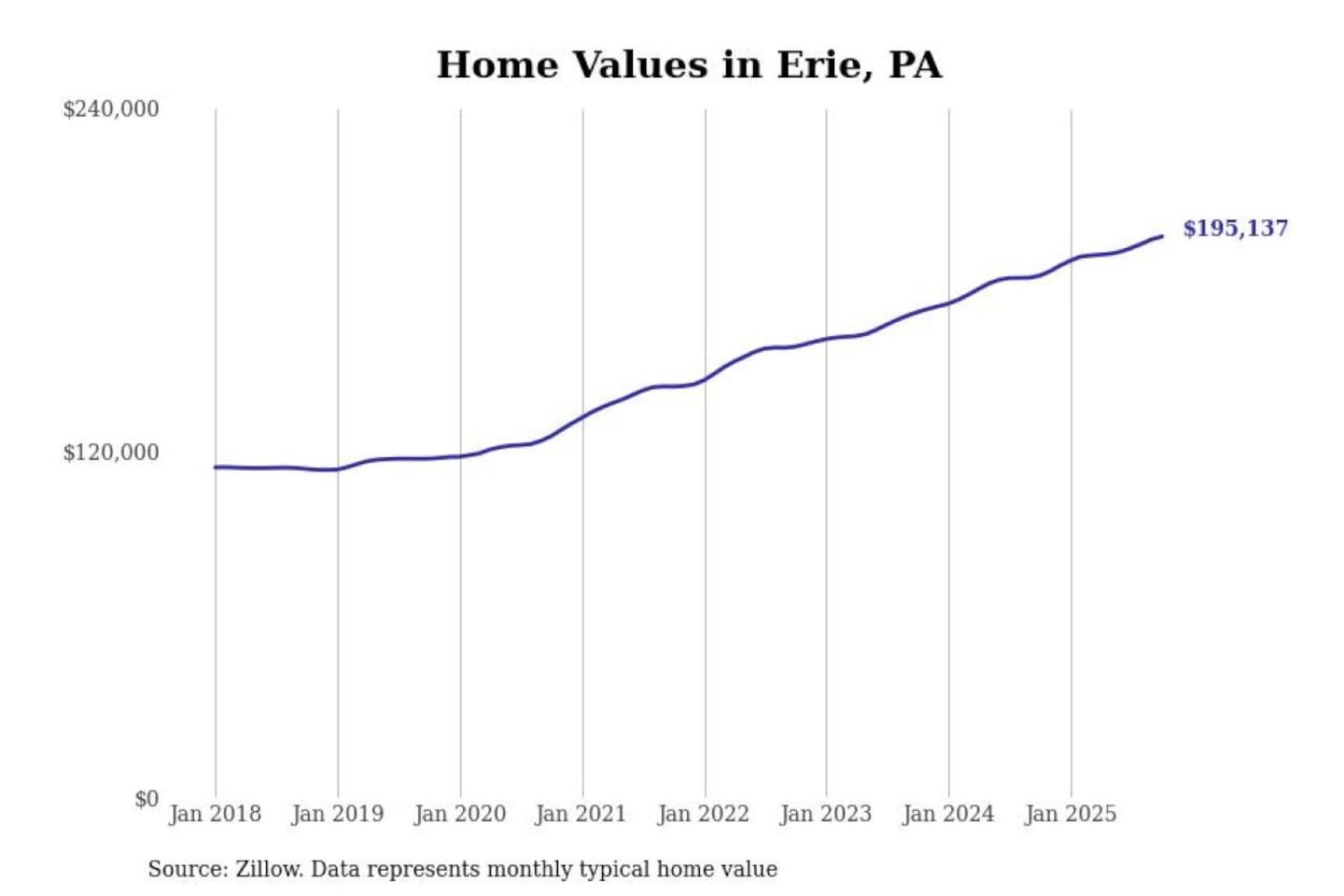 Stacker compiled a list of cities with the most expensive homes in the Erie, PA metro area using data from Zillow. Charts show the monthly typical home value since January 2018.
