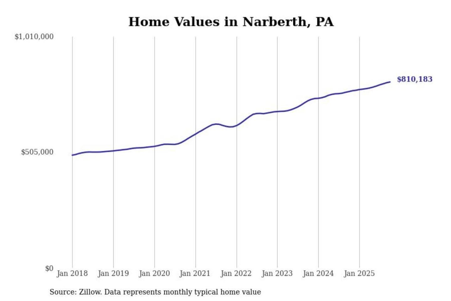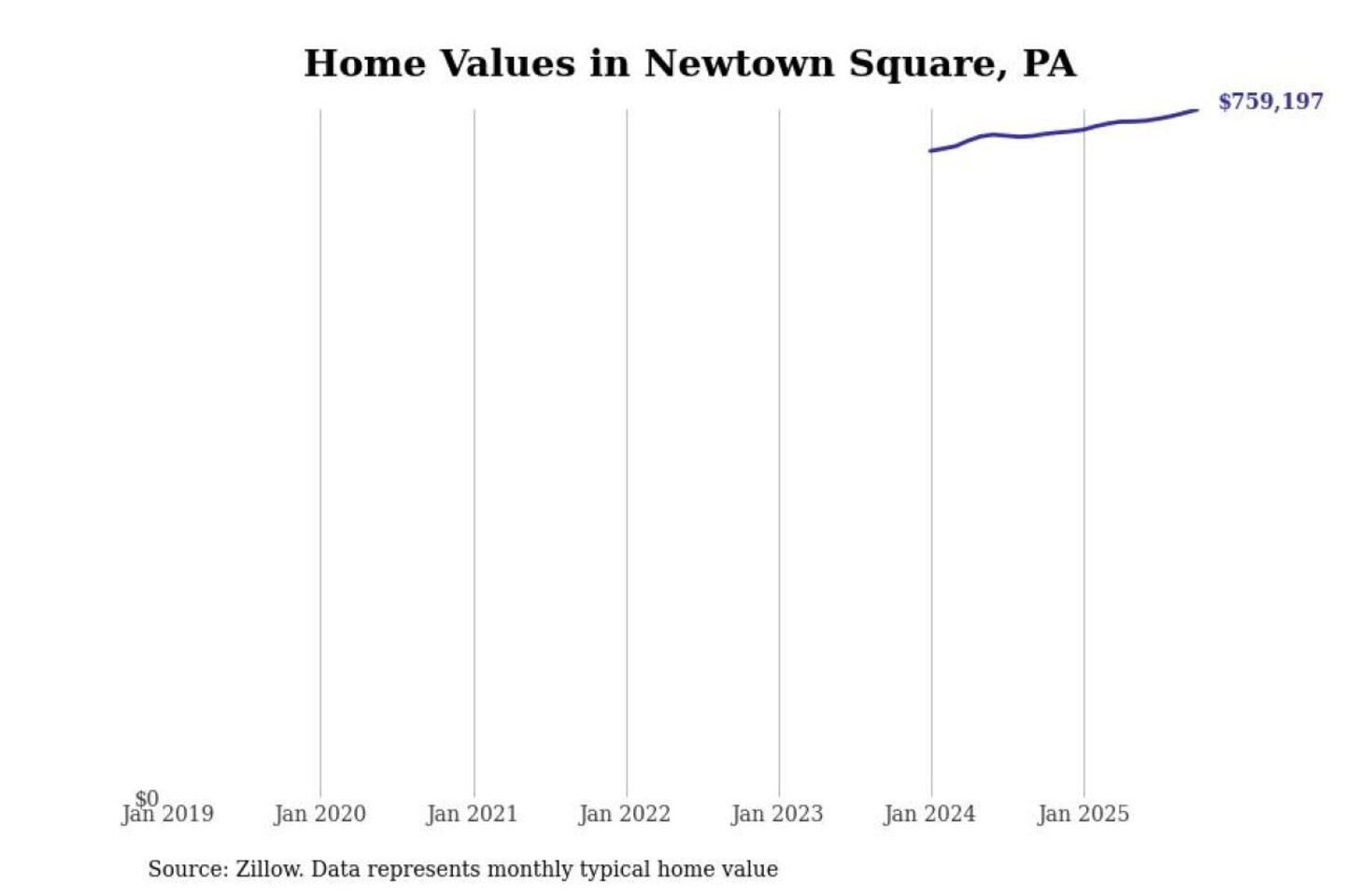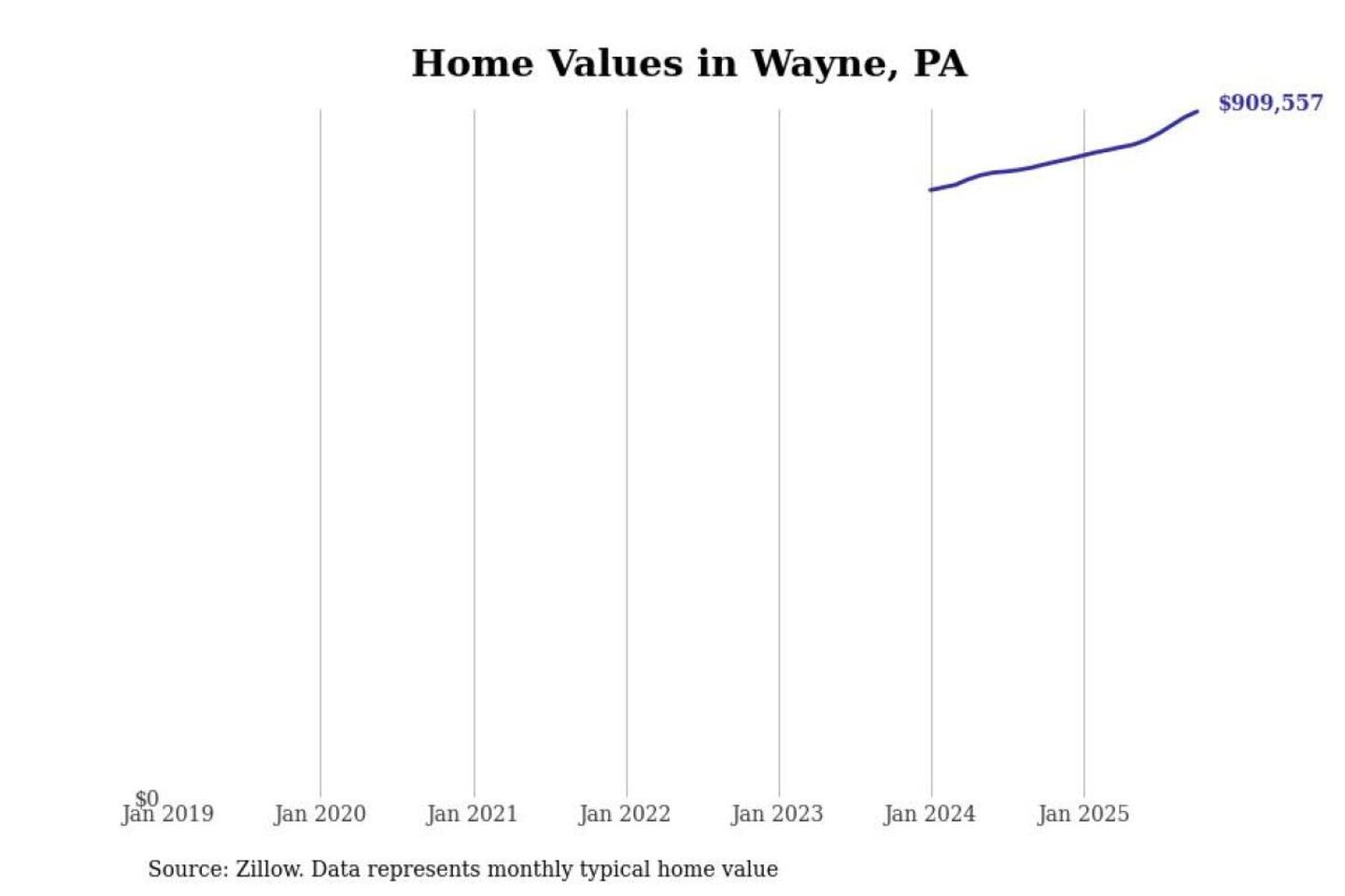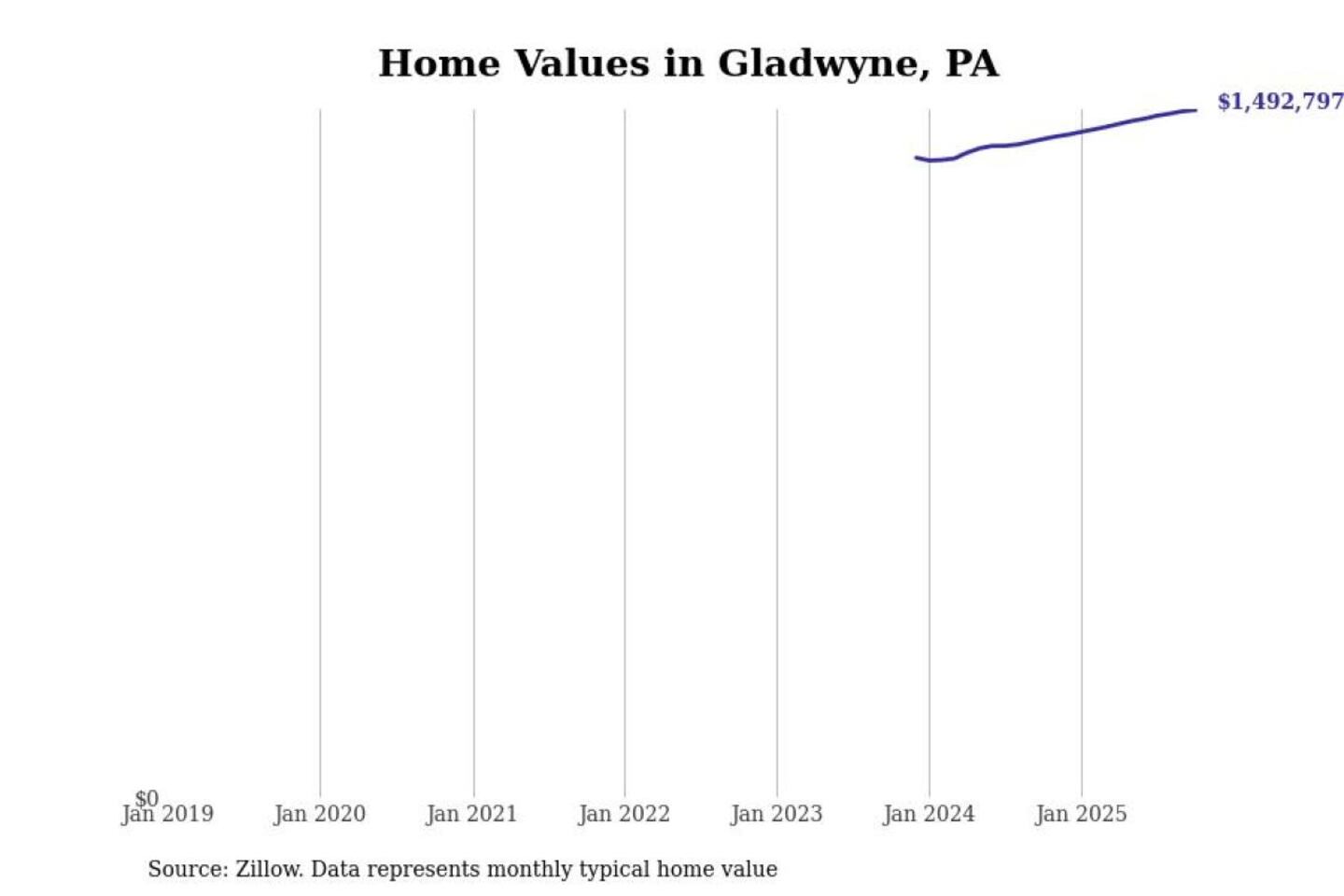 Stacker compiled a list of cities with the most expensive homes in the Philadelphia-Camden-Wilmington, PA-NJ-DE-MD metro area using data from Zillow. Charts show the monthly typical home value since January 2018.