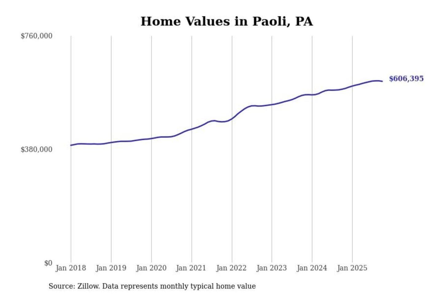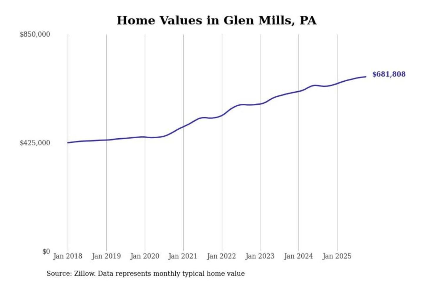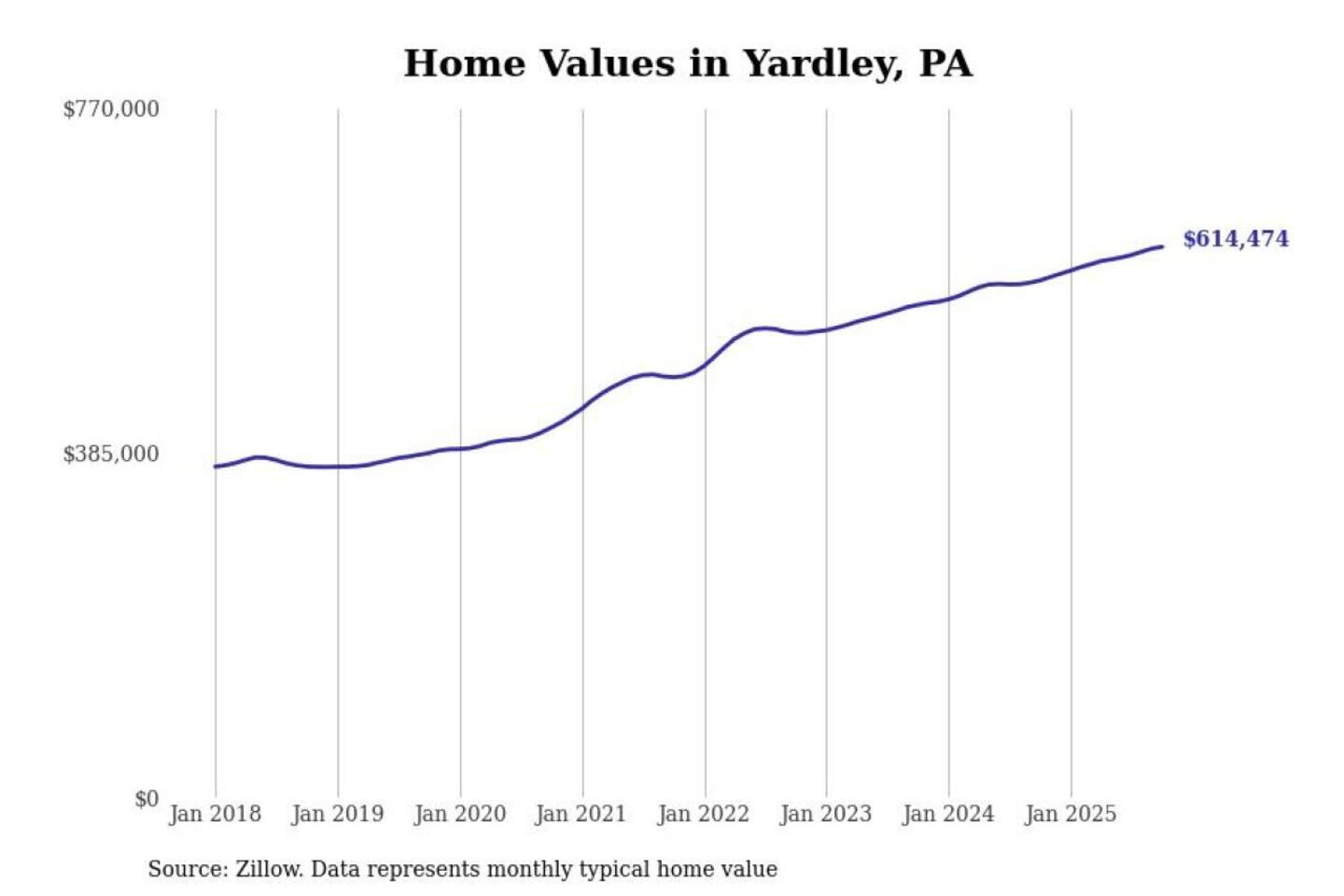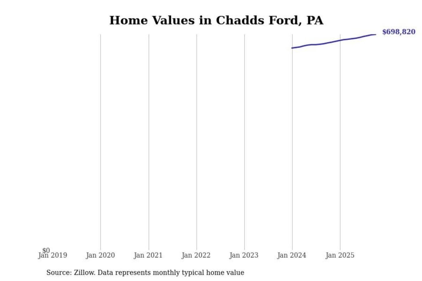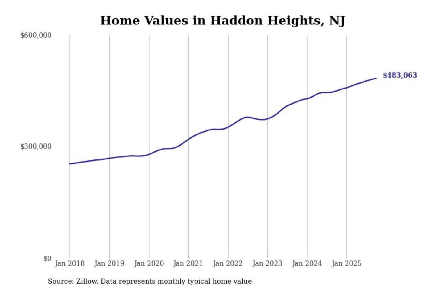 Stacker compiled a list of cities with the most expensive homes in the Philadelphia-Camden-Wilmington, PA-NJ-DE-MD metro area using data from Zillow. Charts show the monthly typical home value since January 2018.
