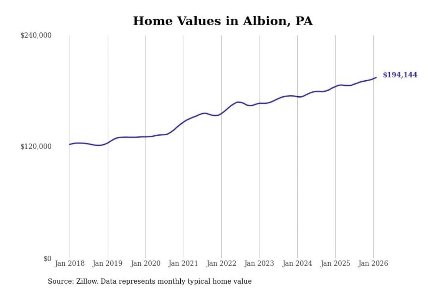 Stacker compiled a list of cities with the most expensive homes in the Erie, PA metro area using data from Zillow. Charts show the monthly typical home value since January 2018.