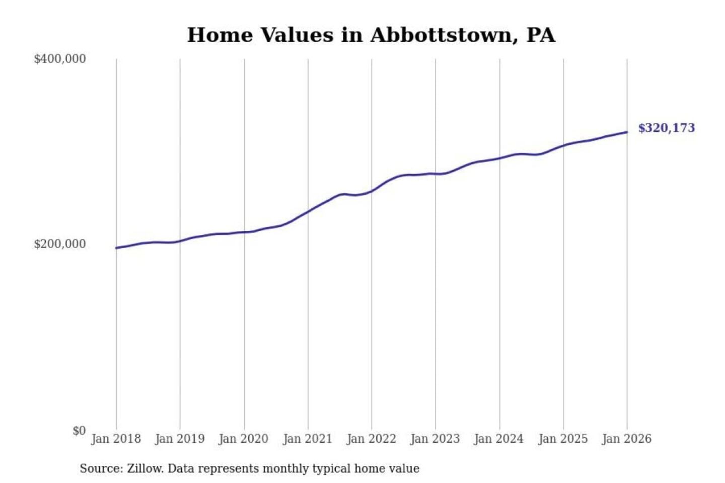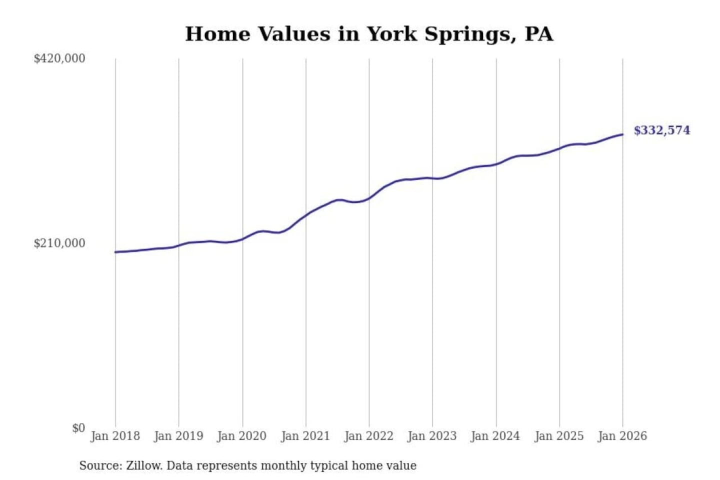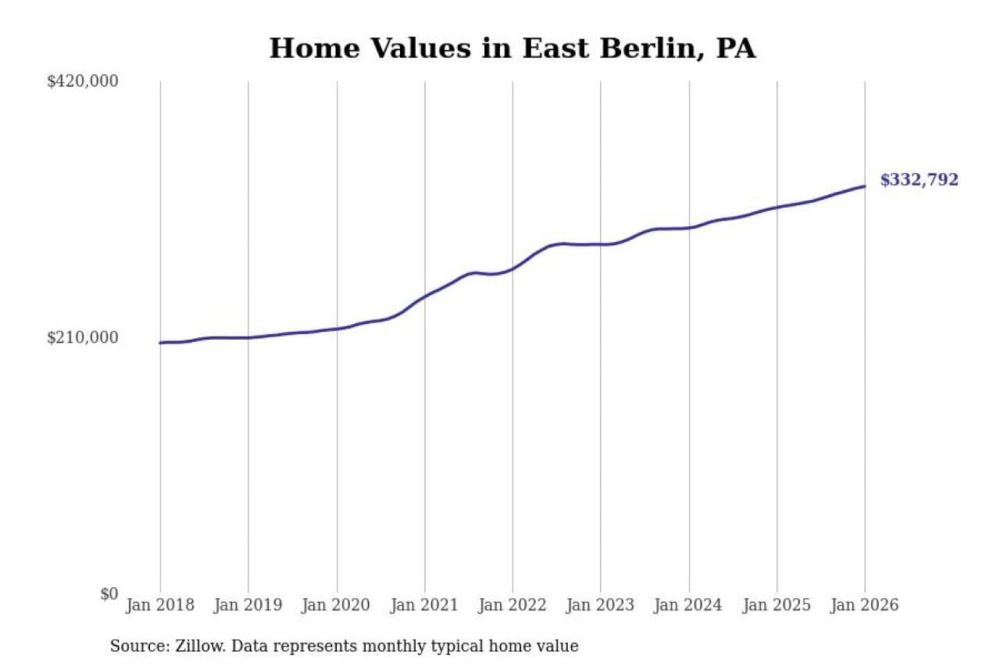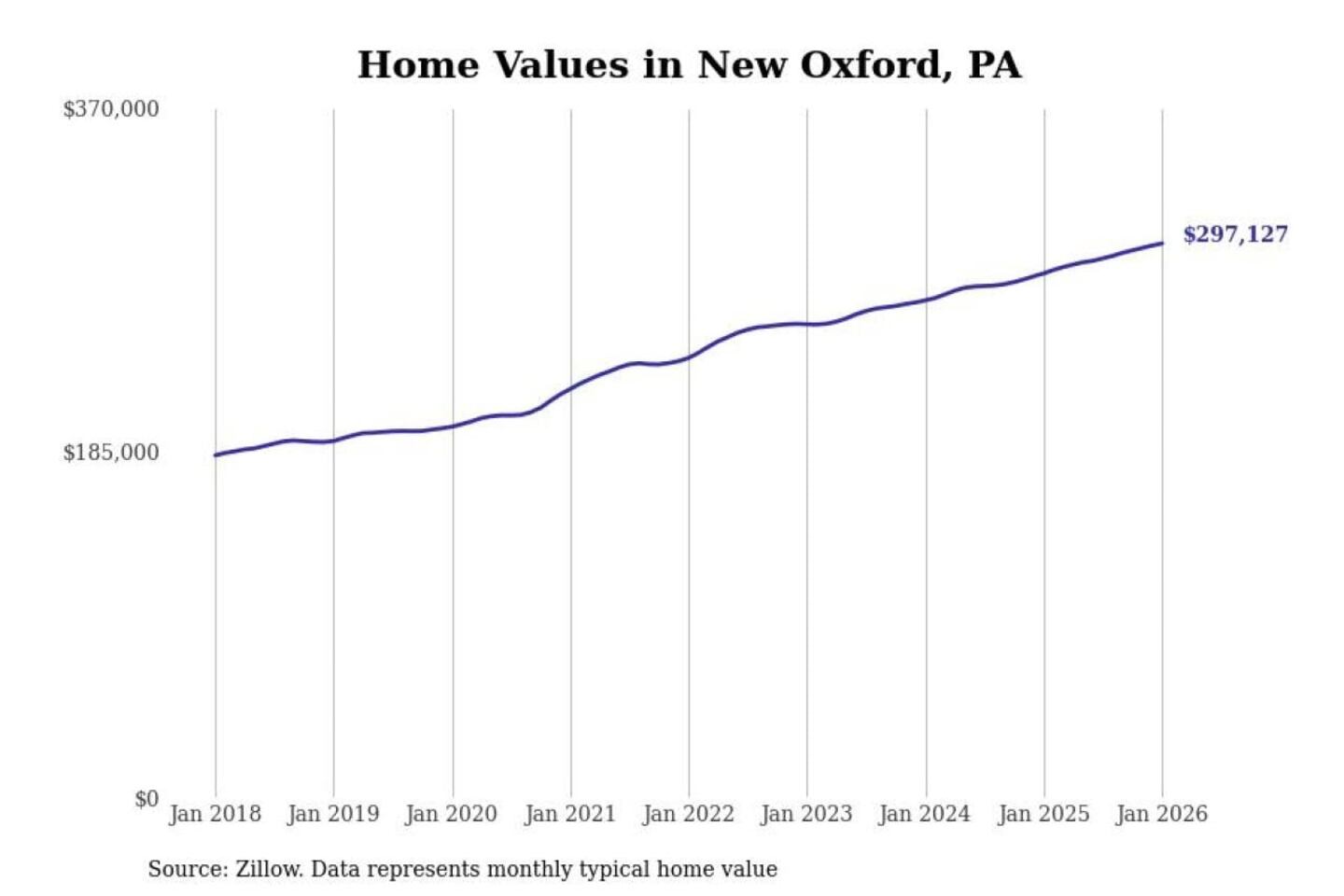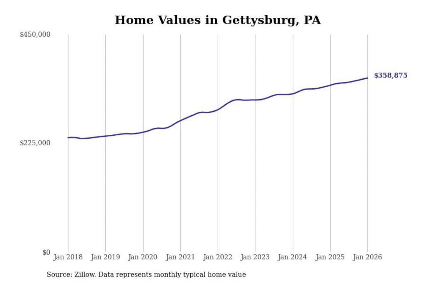 Stacker compiled a list of cities with the most expensive homes in the Gettysburg, PA metro area using data from Zillow. Charts show the monthly typical home value since January 2018.