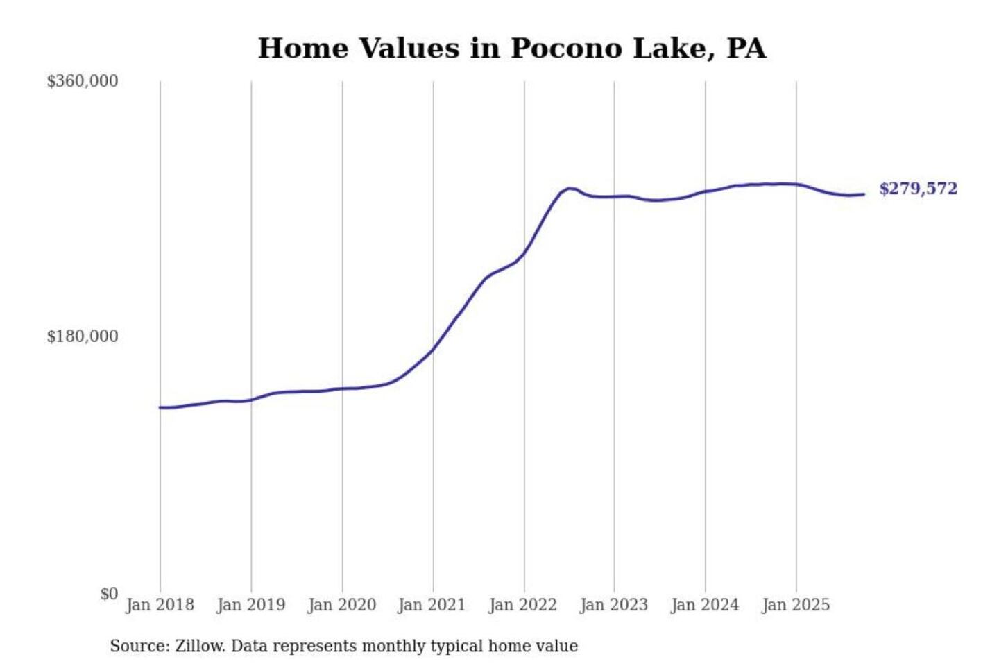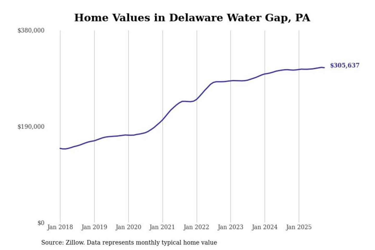 Stacker compiled a list of cities with the most expensive homes in the East Stroudsburg metro area using data from Zillow. Charts show the monthly typical home value since January 2018. All 10 cities and towns with data available were included in the list.