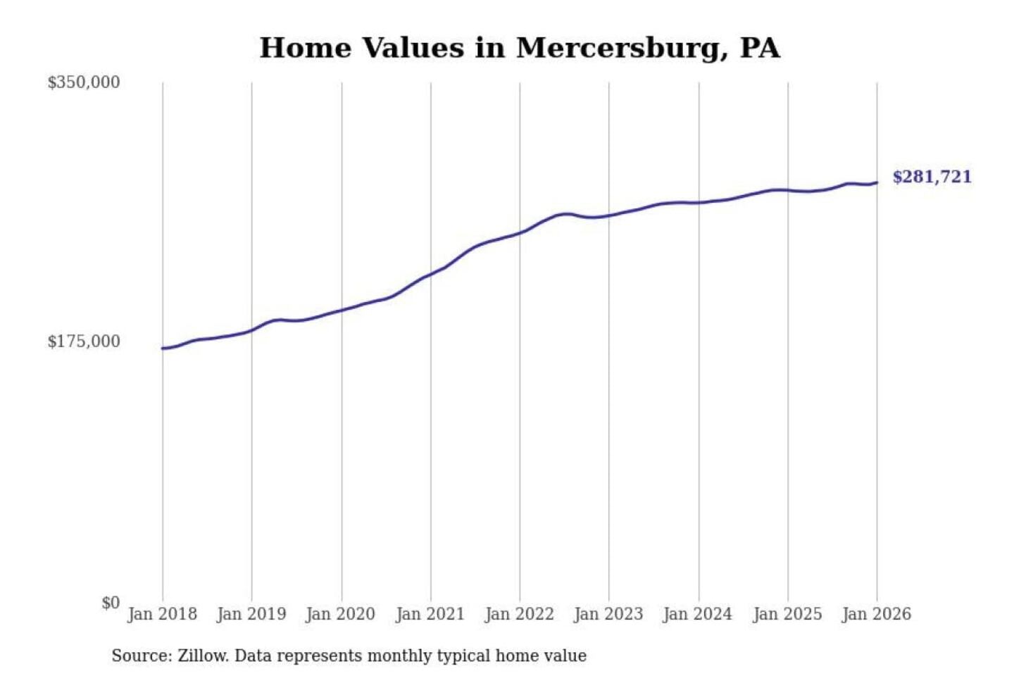 Stacker compiled a list of cities with the most expensive homes in the Chambersburg metro area using data from Zillow. Charts show the monthly typical home value since January 2018. All 7 cities and towns with data available were included in the list.
