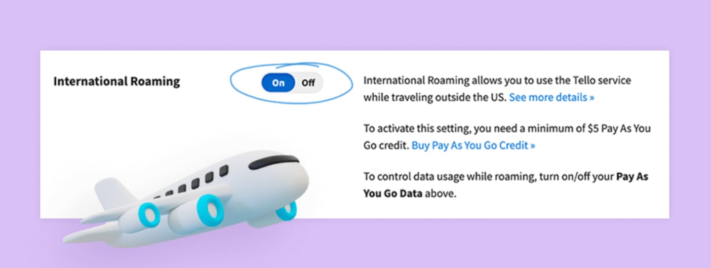 To use your PAYG balance for data domestically or internationally, you'll need to turn on Pay-As-You-Go Data in your Tello account. To do this, log into your Tello account and click "My Tello" and "My Settings." Then, turn on Pay-As-You-Go data.