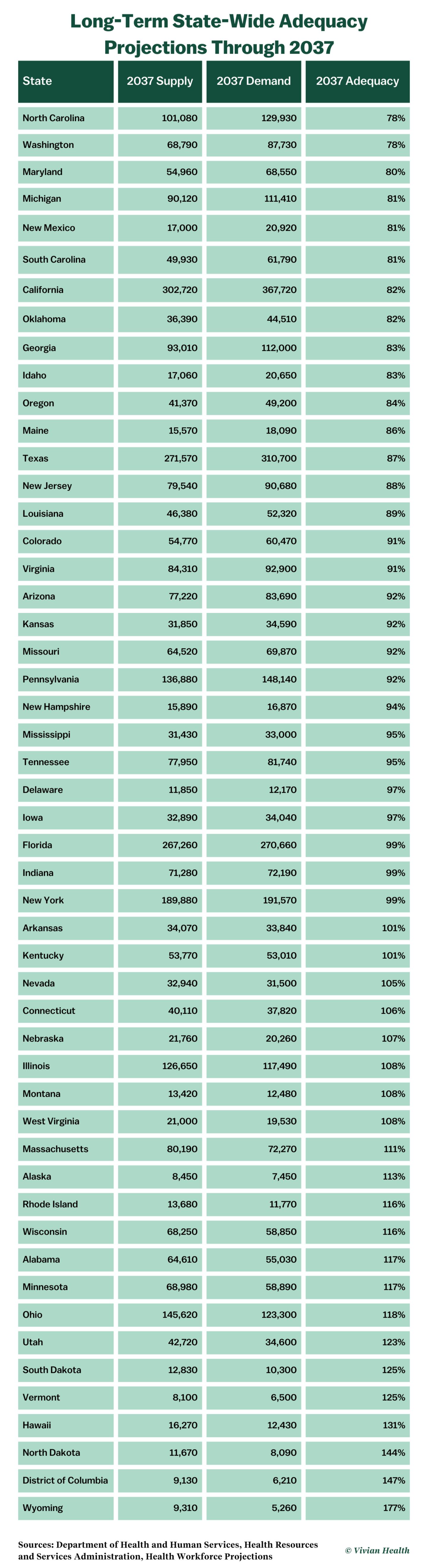Bear in mind that many factors can impact supply and demand, so a projected surplus can quickly become a shortage and vice versa. Many issues can influence whether parameters stay the same for a decade, which is why annual updates are necessary and why Vivian Health updates this post each year as new data becomes available.