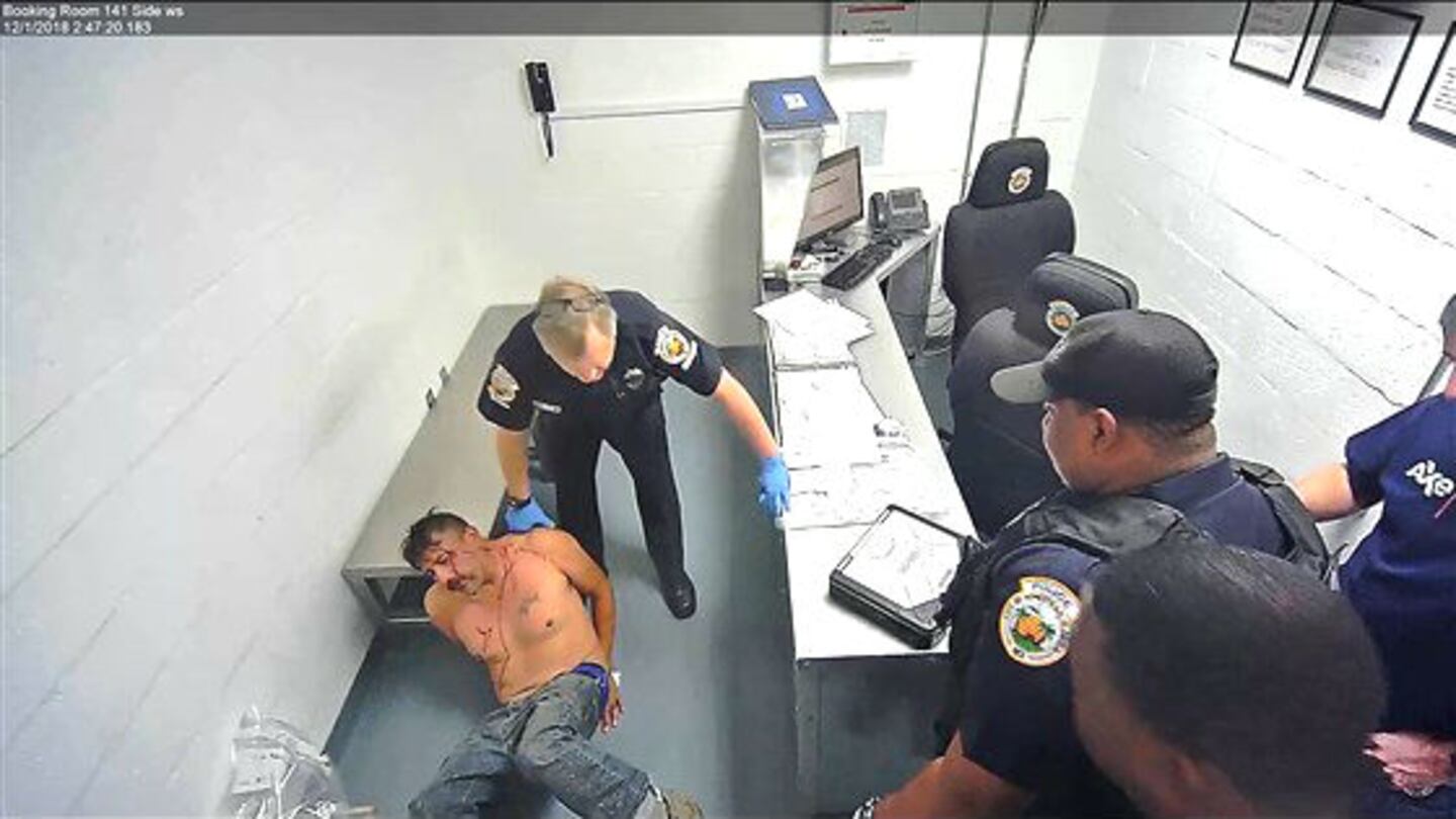 Video released by Rundle’s office shows a shirtless Garcia being led into the Homestead substation by five officers, including Brown, who is wearing blue latex-type gloves. Brown leads Garcia, who appears to be talking or arguing with the officers, into the booking area.