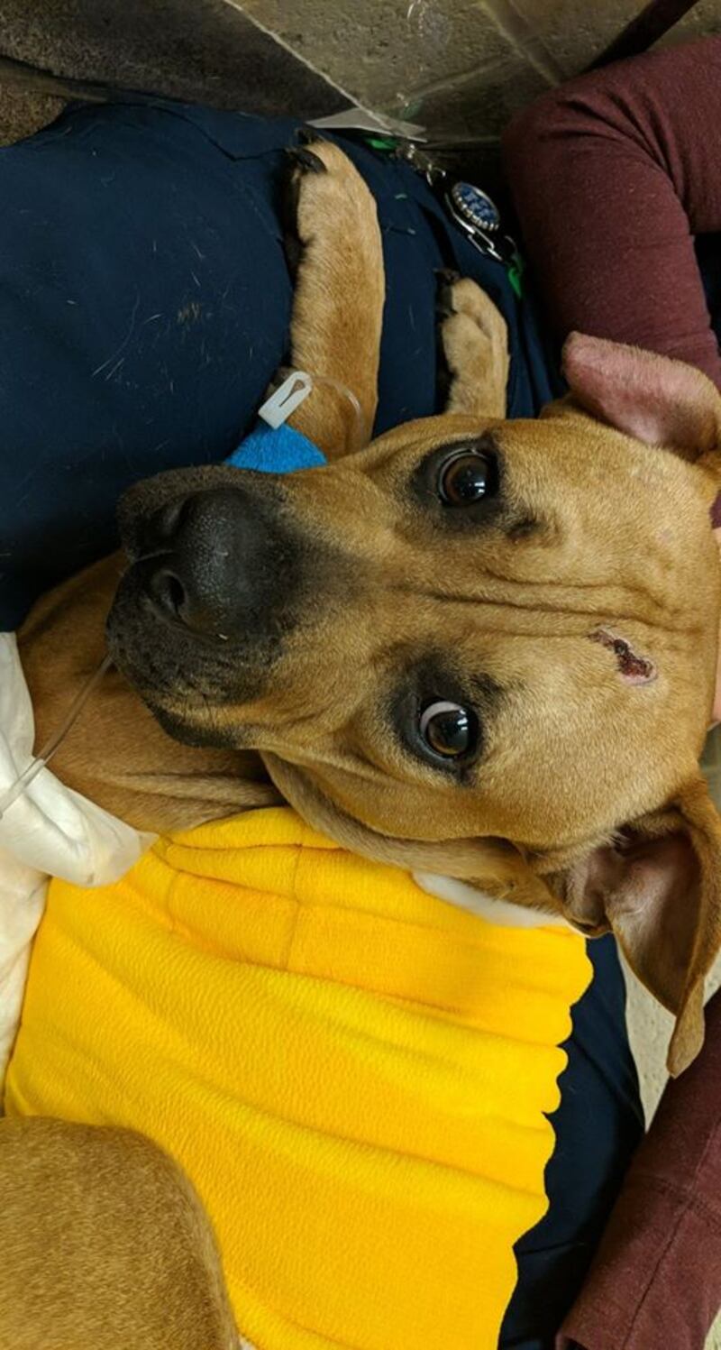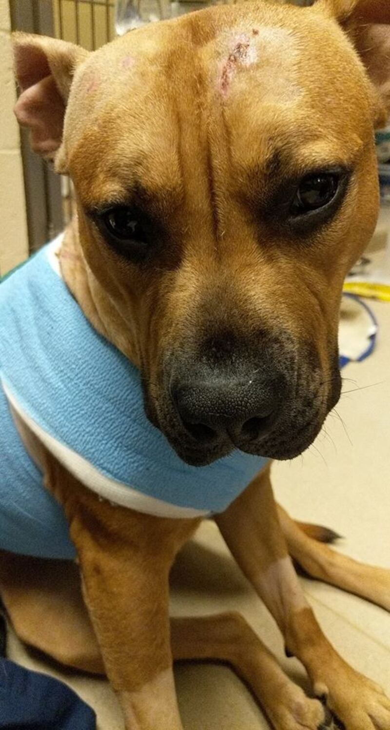 The two dogs suffered burns on their back, neck and ears and Goldie had burns over 80% of her body with exposed muscle and tendons.