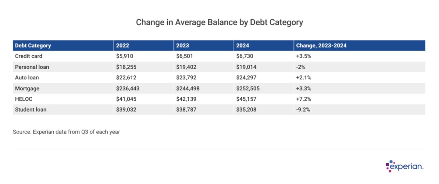 - Personal loan balances fell slightly, to $19,014, after rising for several years prior, although originations for new personal loans remained stable in 2024.
